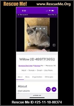 25-11-10-00374C41Willow (f)(female)Siamese mixPrince William County, Manassas, VAID: 48977/3651